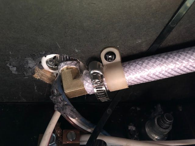 Early on Lew discovered this kink in the freshwater tank vent pipe which would make filling the tank difficult if not impossible: